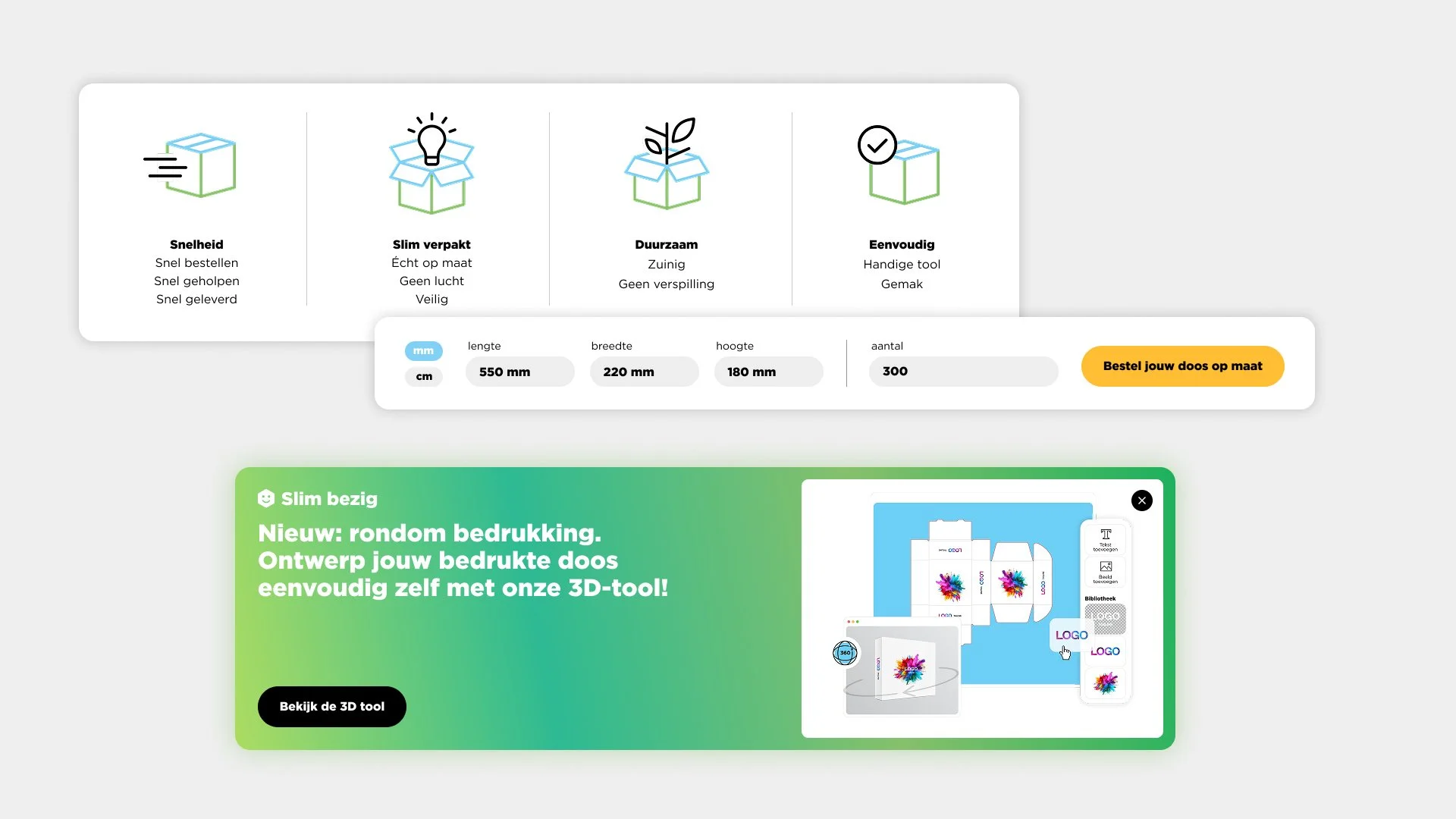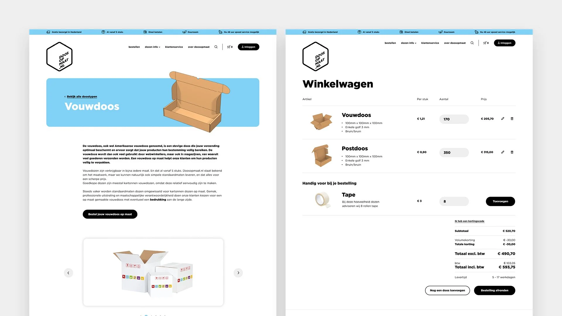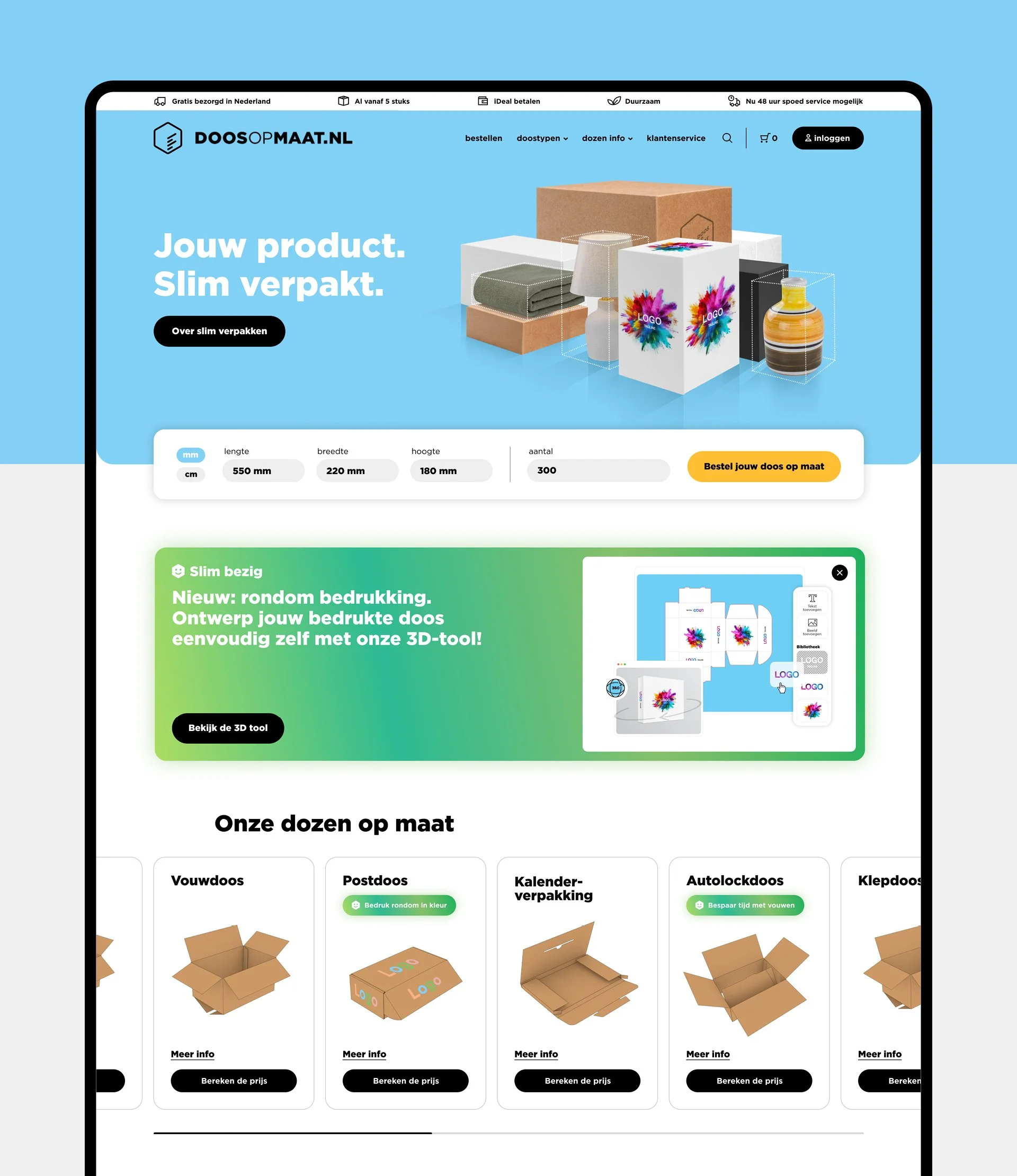 Met een moderne en frisse uitstraling zet doosopmaat.nl zich af tegen de traditionele, ‘dozige’ concurrenten. De intuïtieve, overzichtelijke user flow en interface begeleiden de gebruiker soepel door het bestelproces.