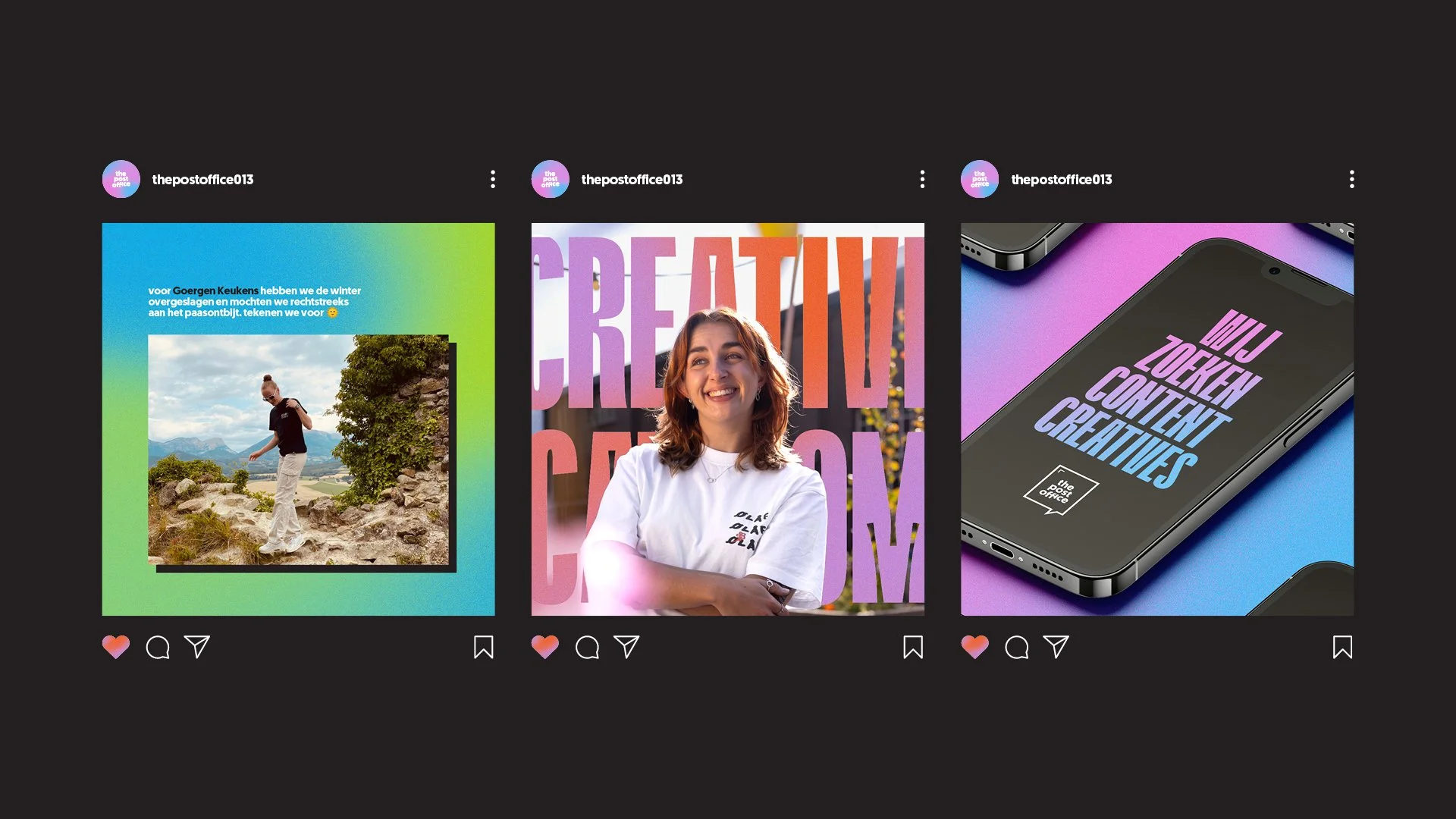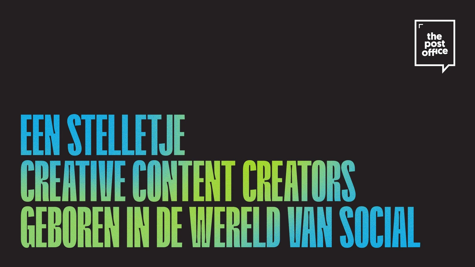 The Post Office is een kleurrijk en energiek team van jonge content creators dat toffe en opvallende content maakt voor bedrijven. De visuele stijl moet diezelfde energie en karakter uitstralen. De vier unieke kleurverlopen staan voor jeugdigheid en fun, terwijl het gebruik van antraciet zorgt voor balans: het onderstreept dat dit niet zomaar een speelse club is, maar een professionele partij die weet wat ze doet. Het resultaat is een stijl die knalt, opvalt, fun uitstraalt én vertrouwen wekt.