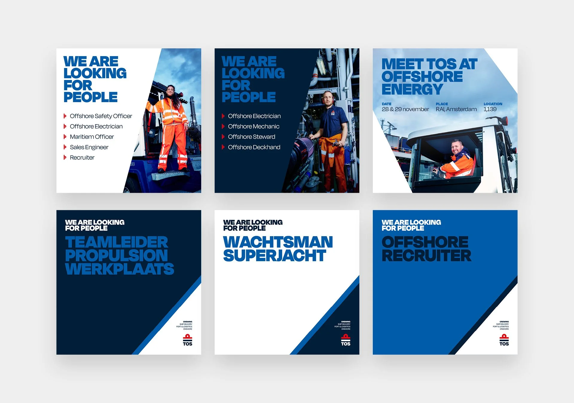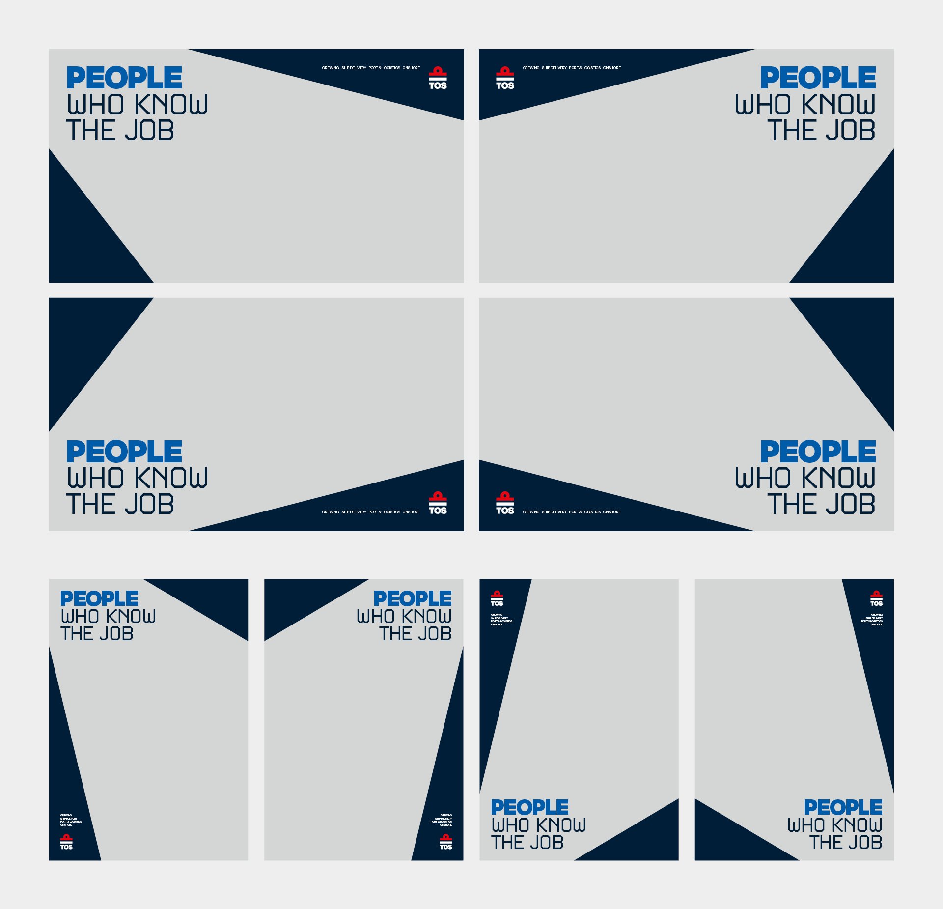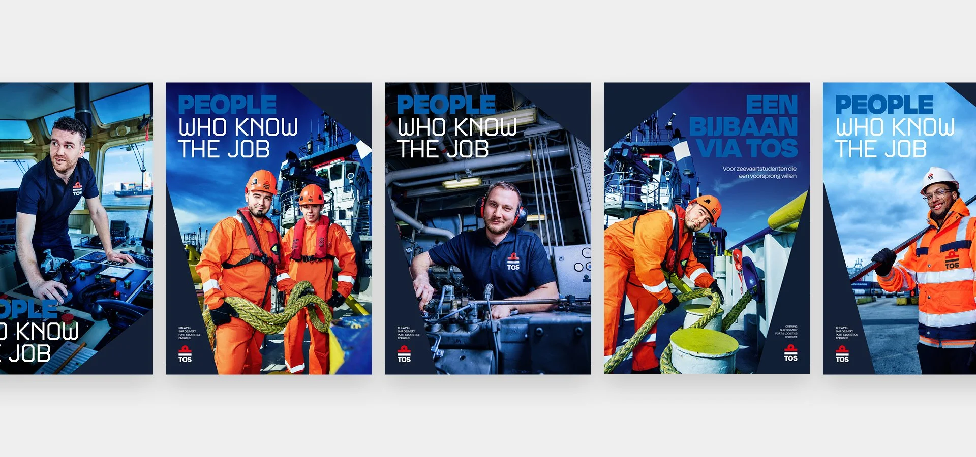 TOS levert mensen aan bedrijven binnen de maritieme sector. De kracht van TOS zit dan ook echt in de mensen zelf. Het concept ‘People who know the job’ zet hen in de spotlight – en de visuele stijl moest dat ook uitstralen. Dit heb ik gedaan met het lighthouse-effect (maritiem, lighthouse... je snapt ’m). Binnen deze simpele maar duidelijke stijl wordt de focus direct naar de mensen getrokken.